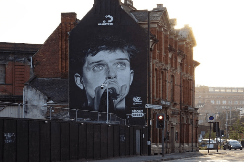 Ian Curtis mural on The Star & Garter and Andy Rourke mural on The Wheatsheaf both by Akse