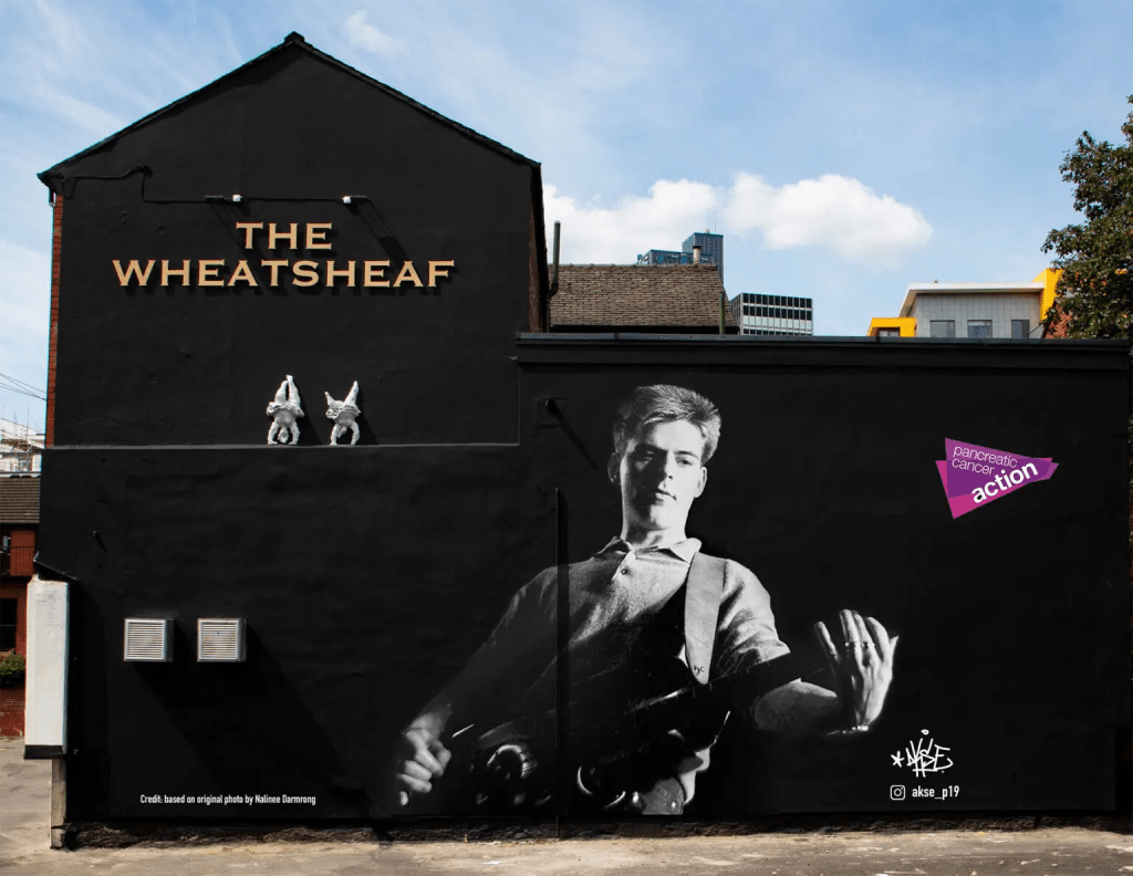 Hooky : The landmarks are coming thick and fast, because Mike Joyce from The Smiths managed to get a mural done for Andy Rourke, which is perfectly in situ in Tib Street. It’s right in the middle of Tib Street, in a pub setback, and it looks fantastic. So, now we’ve not only got Ian on The Star & Garter. We’ve also got Andy Rourke in the middle of Tib Street.